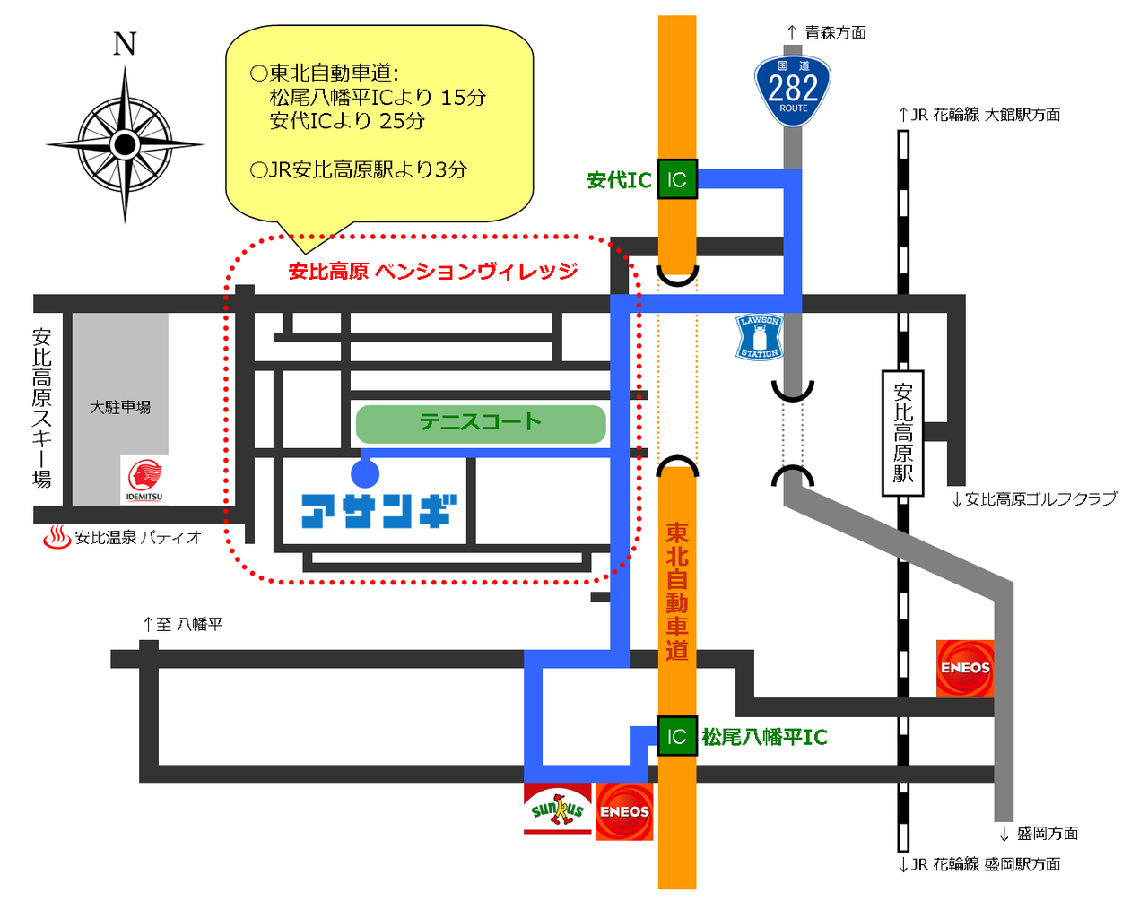 | Remarks | ANAホリデイ・イン温泉 | ANAホリデイ・インヒルズ | 安比高原スキー場 | ANAクラウンプラザ | ペンション前 | 盛岡駅 | ||
